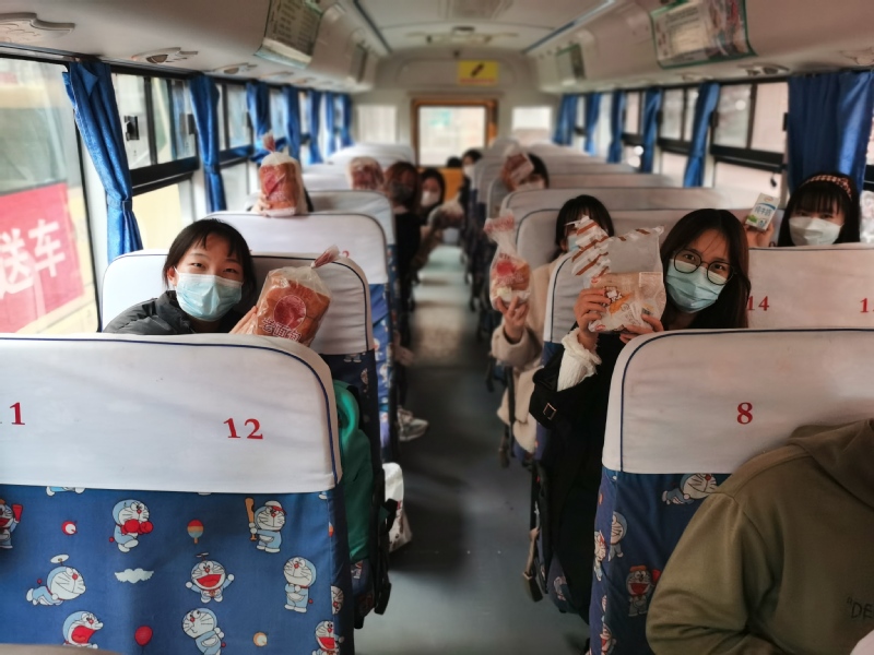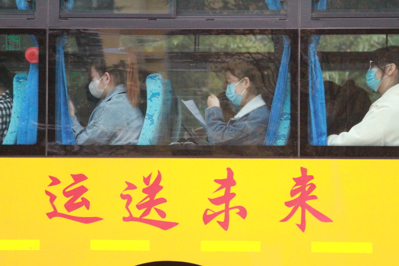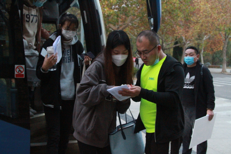 清晨5点的校园一片寂静,准备教资考试的同学们已经收拾好考试相关材料在学校图书馆和西门集合。车到后,带队老师开始清点人数,同学们都戴好口罩,保持1米间距,按顺序坐上学校准备的大巴车。