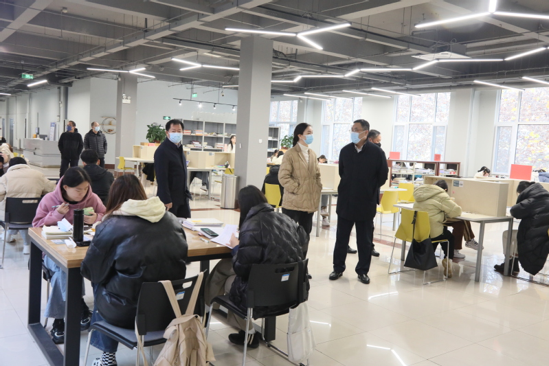 在图书馆,临近考试季,在温暖、宽敞的阅览大厅,同学们正在聚精会神地读书学习。校领导了解了公共场合疫情防控措施落实情况,提醒学生戴好口罩,培养良好的卫生习惯,切实保障个人健康。要求有关部门做好室内通风、病毒消杀,做好学生卫生健康教育,落实好部门和属地联动,切实把疫情挡在校园之外。