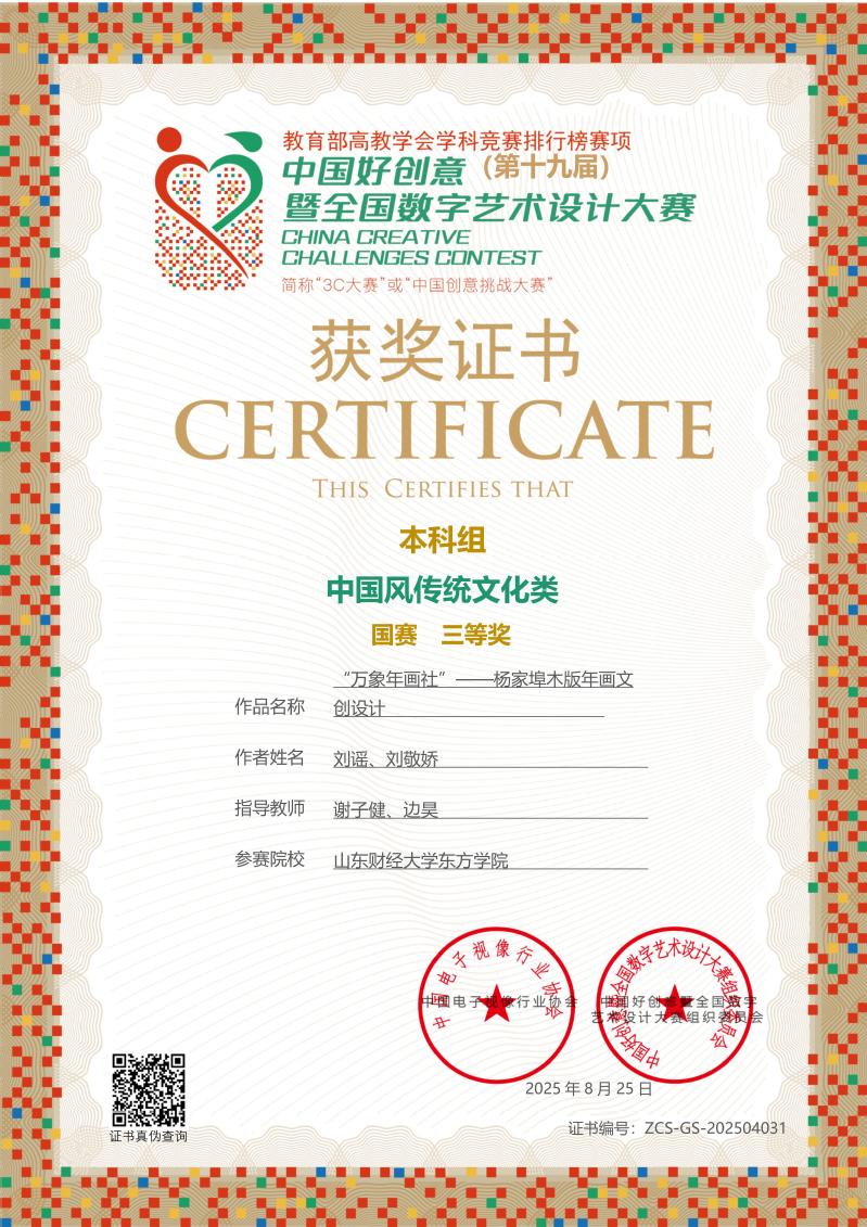 第十九届中国好创意大赛全国总决赛,共收到35万余件作品参赛,山东省参赛29000余件,国赛获奖率3%,省赛获奖率5%。我校学子凭借深厚的专业功底和创新设计理念斩获佳绩。其中,刘谣、刘敬娇创作的《万象年画社•杨家埠木版年画文创设计》和吕德新、石继超、王子腾、张思雨、张杰、张凯文、焦述奕创作的《剑魂》荣获国家三等奖。《固执》和《时间胶囊》荣获省赛三等奖、《错位的储物柜》荣获省赛优秀奖。