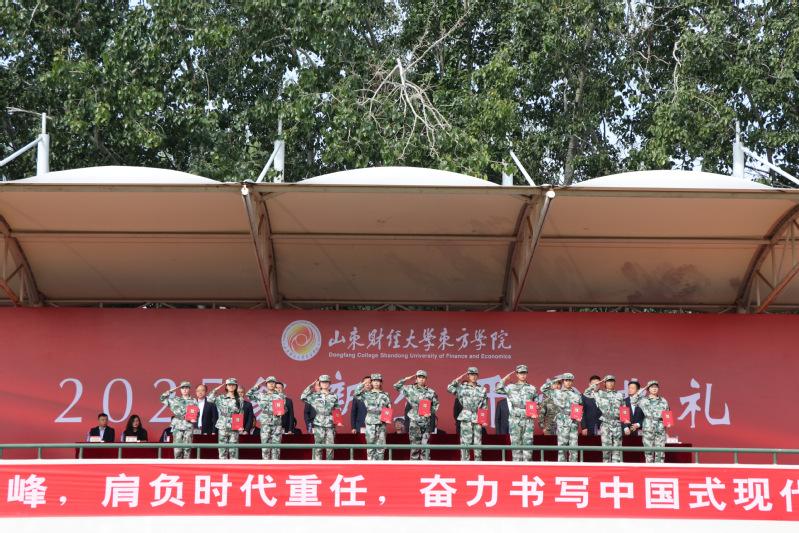 在典礼上,范玉宝作了题为《韶华莫负奋楫潮头做可堪民族复兴大任的时代新人》的讲话。他首先代表学校向完成军事训练的全体2025级同学表示衷心的祝贺!他指出,办学生向往、家长满意、社会赞誉的高校,是山东财经大学东方学院始终不渝的愿望。2025级新生的到来,学校倍感珍视、深感责任重大,正用情、用心、用力来诠释以学生为中心、以学生成长成才为目标的价值追求,期待同学们在这里尽情探索,勇敢逐梦,最终成为自己最想成为的模样!