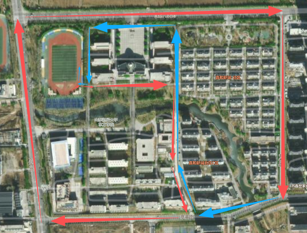 1.运动员起跑后在田径场跑2.4圈后出运动场进入凤凰南路,从学校东南门进入萃英街,经凤天路——正阳门大街——书香路——萃英街(顺时针跑),最后再从学校东南门进入,直行向北跑到学校东北角,经凤凰北路返回田径场逆时针方向跑0.6圈终点处(主席台前)冲刺,用时短者为胜(比赛路线详见附件2)。