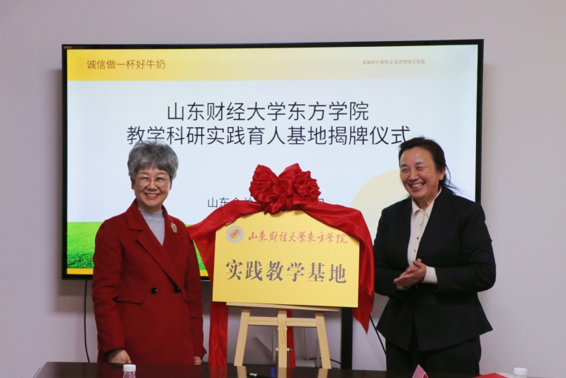 在大家热烈的掌声中,山东财经大学东方学院工商管理学院党总支书记、院长李秀荣与山东金兰乳业有限公司总经理法文静共同签署了校企合作协议,并为“山东财经大学东方学院实践教学基地”揭牌。