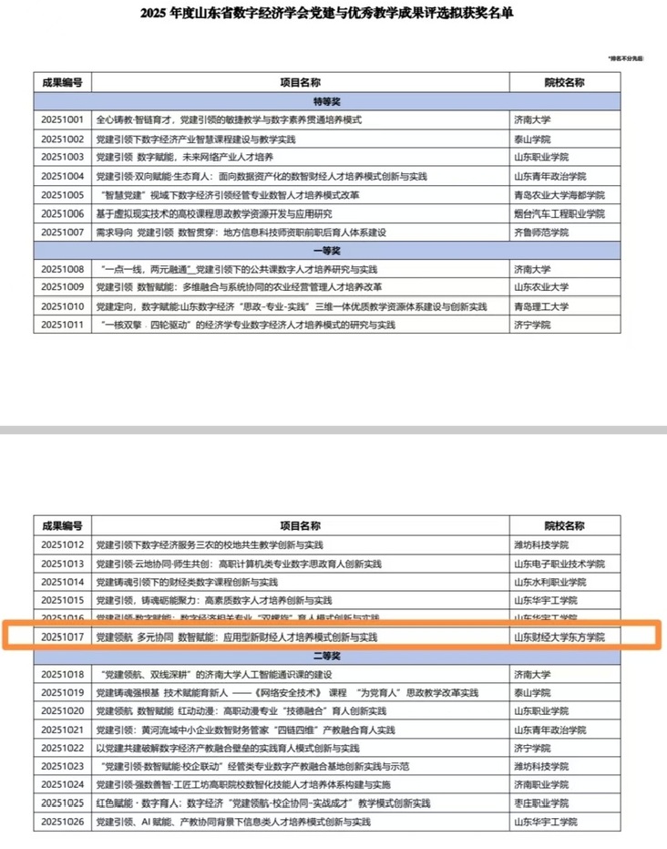 为深入贯彻党的教育方针,落实立德树人根本任务,锚定数字强省战略部署,山东省数字经济学会组织开展了2025年度党建与优秀教学成果评选工作。近日,评选结果揭晓,我校财税金融学院完成的《党建领航多元协同数智赋能:应用型新财经人才培养模式创新与实践》成果,凭借鲜明的党建引领特色、深度的数智融合创新及显著的育人成效,在全省众多申报项目中脱颖而出,荣获一等奖,充分彰显了学校在党建引领下数字财经人才培养的高质量发展成效,彰显了学校推动我省数字经济产业高质量发展的使命担当。