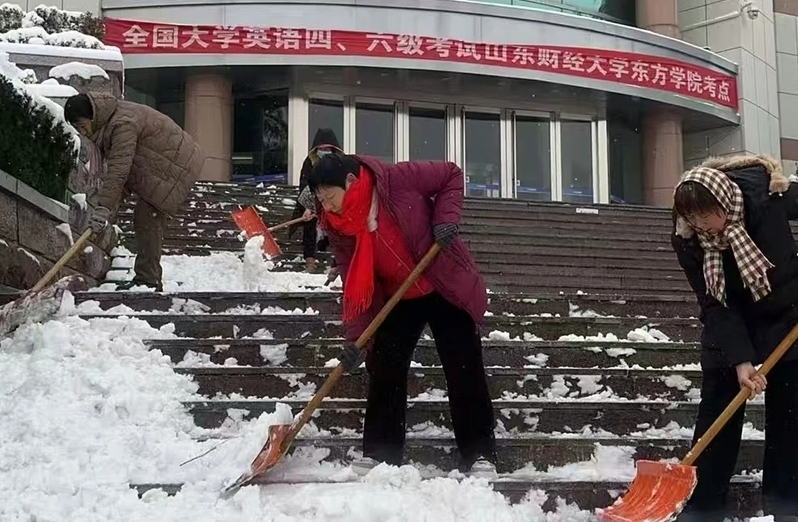 12月12日夜,暴雪突降,温度骤降,也给次日的全国大学英语四六级考试的顺利开考带来了挑战。为确保校园道路畅通,保障师生出行安全,学校提前部署,相关部门闻雪而动,迅速启动应急方案,切实保障了四六级考试的顺利进行。党政办公室及时调整班车时间,确保监考人员安全准时到校;后勤管理处根据天气预报得知考试前一日有降雪,提前召开应急会议,制定专项除雪预案。13日清晨 6 时 20 分,物业工作人员全员到岗,分组作业,冒着严寒对公寓区、教学楼、考场周边及主干道开展清扫,同步进行除雪工作。在开考前一小时,主要道路和考场入口地面已经全面清扫完毕,最大程度降低了冰雪天气对师生出行的影响,为考试创造了良好的外部环境。