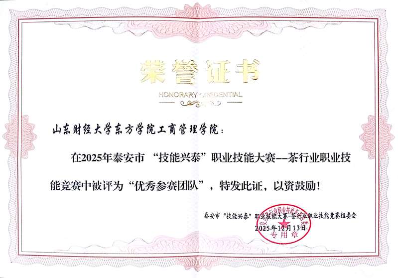 近日,2025年泰安市“技能兴泰”职业技能大赛——茶行业职业技能竞赛落下帷幕。我校工商管理学院因组织有序、选手表现优异,被组委会授予“优秀参赛团队”荣誉称号(证书颁发时间为2025年12月13日),14名参赛选手成功斩获高级茶艺师技能证书,用专业实力展现了东方学子的职业素养与茶文化传承风采。