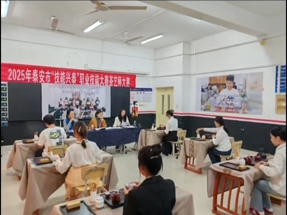 决赛现场,我校参赛选手与众多参赛队伍同台竞技,在茶艺展示、茶叶审评等赛项中各展所长。温杯烫盏的礼仪规范、置茶冲泡的手法精妙、分茶奉茶的仪态优雅,选手们将泰山茶文化的深厚底蕴与现代茶艺的创新表达相融合,让茶汤的醇厚与茶艺的雅致相得益彰;在茶叶审评环节,选手们凭借敏锐的感官辨识力,精准完成茶叶品质评定,尽显专业积淀。由茶行业资深专家组成的评委团,从职业素养、操作规范等多维度进行综合考评,对我校选手的表现给予高度评价。