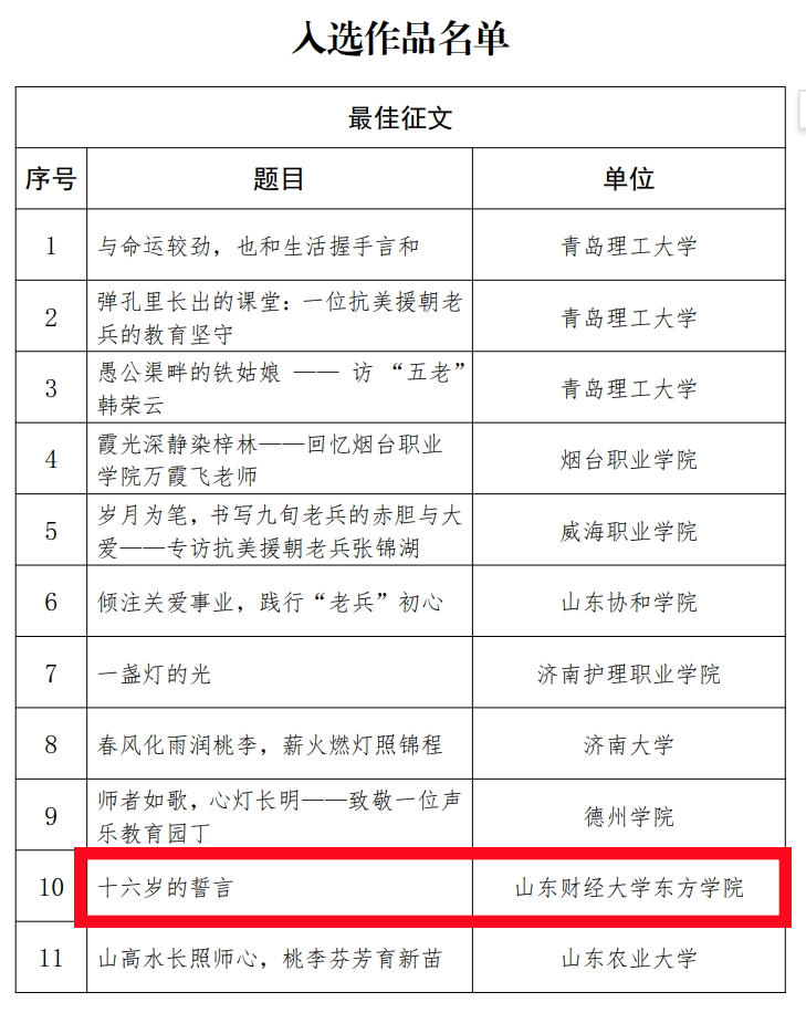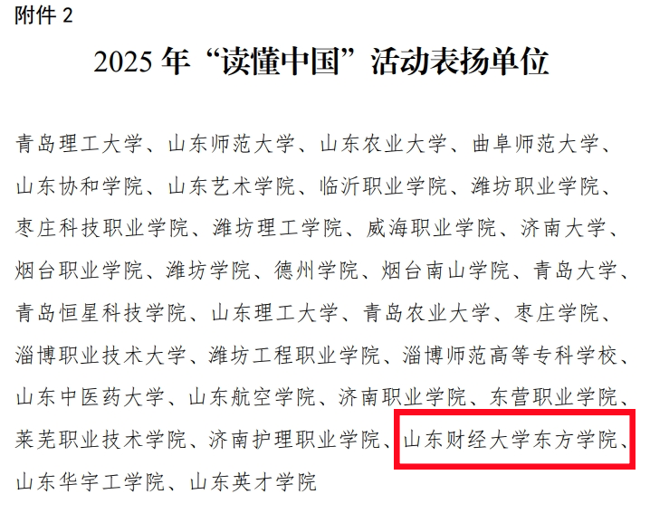 日前,山东省教育厅关工委印发《关于公布2025年“读懂中国”活动入选作品名单的通知》(鲁教关委函〔2025〕8号),我校会计学院学生王子伊(指导教师侯雪)撰写的征文《十六岁的誓言》斩获最佳征文。我校同时获评2025年“读懂中国”活动表扬单位。