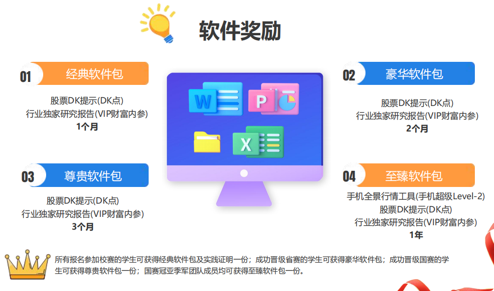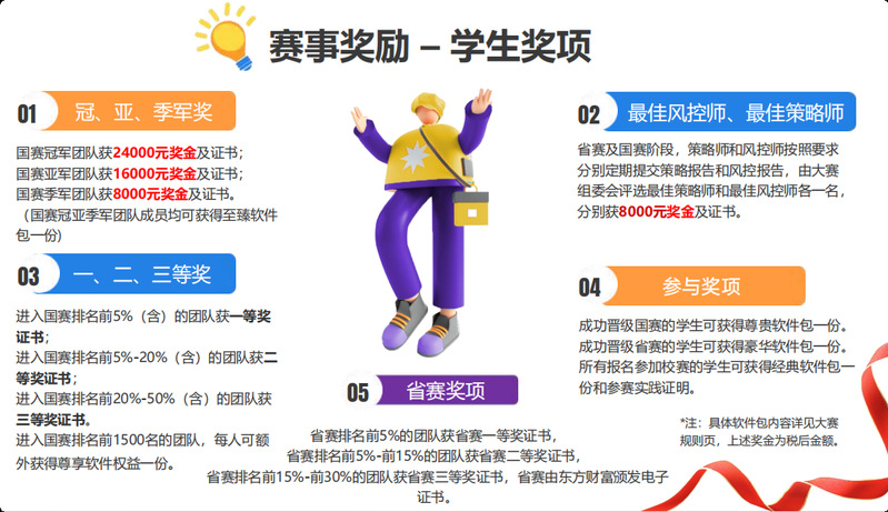 本次赛事为广大青年学子搭建高水平金融实践平台,把专业理论转化为实战能力,依托百万模拟资金真实操盘,直面市场波动、锤炼投资思维;更能与全国高校学子同台竞技,在交流比拼中拓展视野、提升金融素养。赛事兼具专业性与实践性,既是知识运用、风险把控的综合考验,也是展现青春才干、实现自我超越的重要舞台,丰厚荣誉与奖励静待优胜者。诚邀全体同学积极报名参与,在金融实践中增长才干,以青春力量拥抱时代机遇!