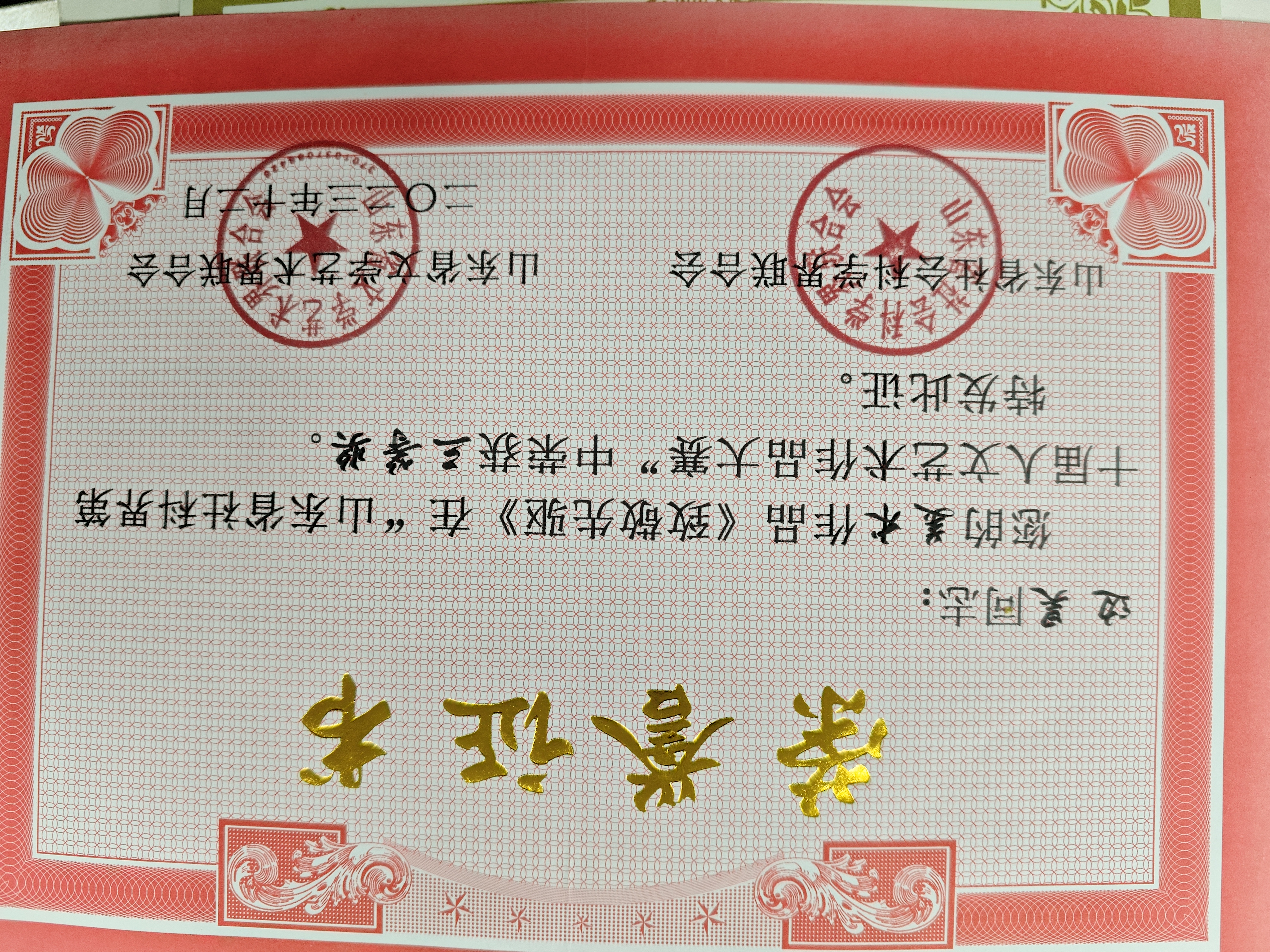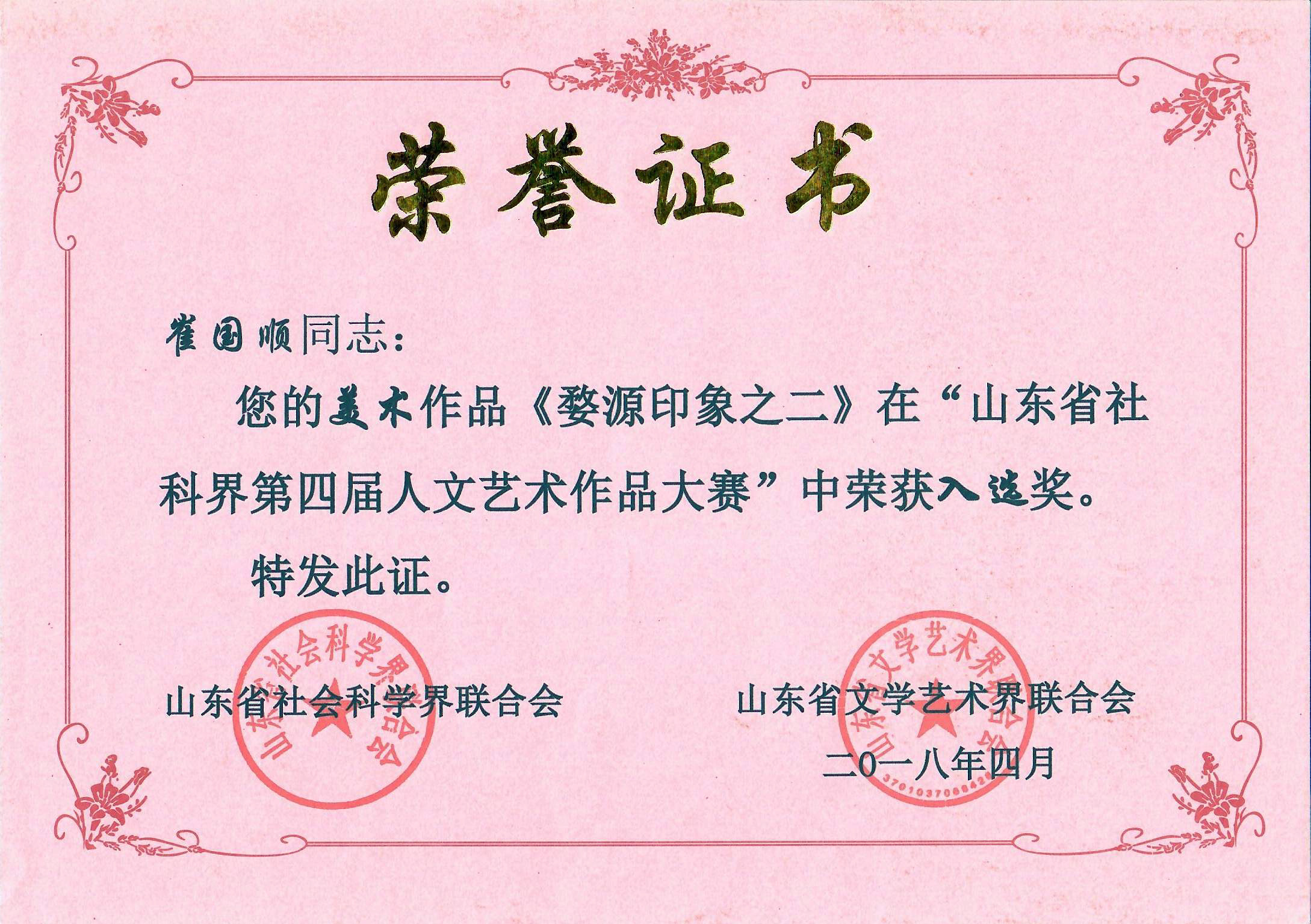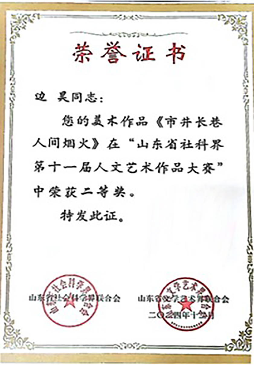 山东社科界人文艺术作品大赛获奖证书