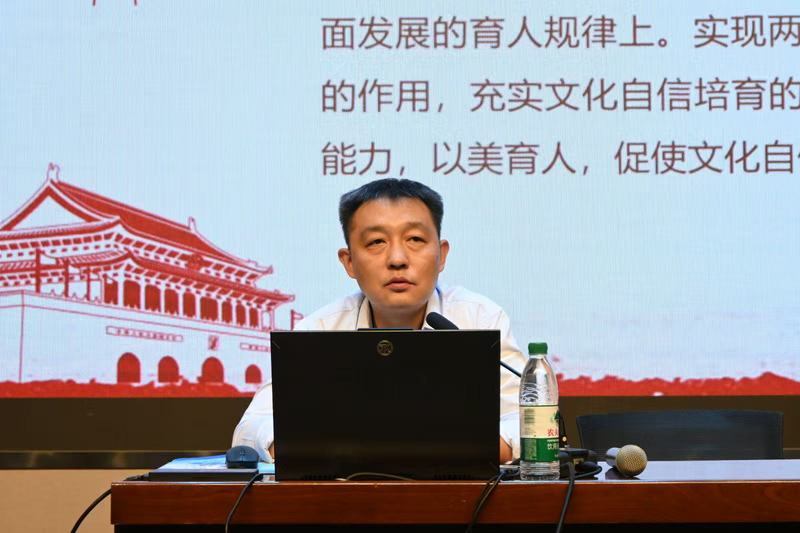 围绕新时期大学生文化自信的培育,杨晋东老师从三个方面展开阐述:一是当前大学生文化自信面临的问题与挑战;二是高校美育与文化自信培育的内在契合性,高校作为文化传承与创新的主阵地,应立足中华礼乐文化,遵循全面发展育人规律,与文化自信培育高度融合;三是探索美育与文化自信结合的实践路径,为学院党员和入党积极分子在日常教学和校园活动中践行文化自信指明方向。