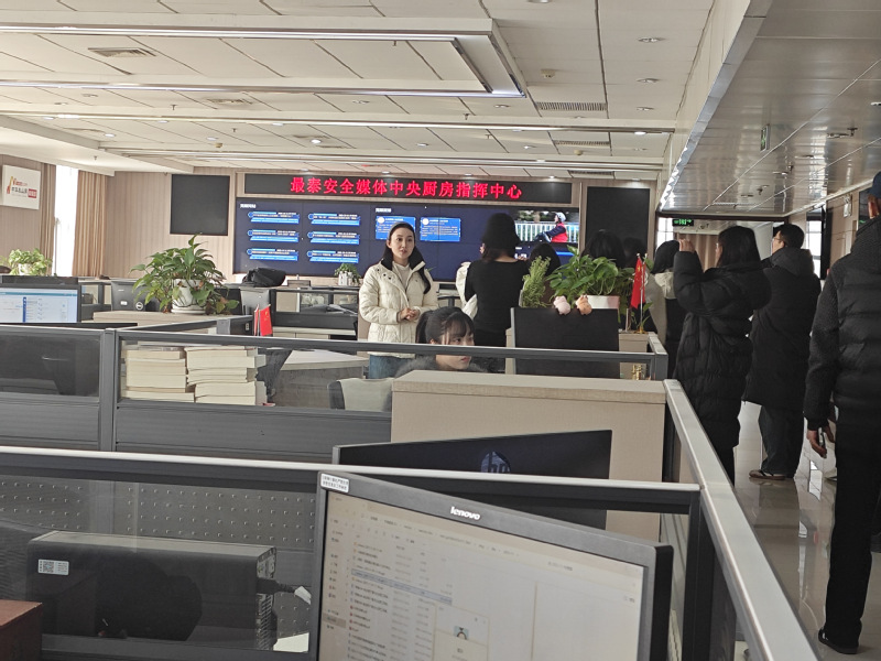 随后,师生一行先后走进报社演播室与“最泰安全媒体中央厨房指挥中心”,沉浸式体验全媒体时代新闻生产的全流程。演播室内,专业摄像机、灯光设备、提词器等一应俱全,规范的直播场景与严谨的工作流程,让同学们身临其境感受到新闻节目制作的专业氛围,不少同学主动向工作人员请教设备操作与场景布置的细节。在中央厨房指挥中心,电子大屏上各类数据实时跳动,涵盖内容点击量、传播渠道分布、用户画像等维度;工作人员通过智能化系统统筹调度采、编、发全环节,清晰严谨的新媒体内容审核流程与高效协同的工作机制,生动诠释了全媒体时代“一次采集、多元生成、全平台分发”的新闻生产新模式,让同学们对新闻传播的高效性与创新性形成了全新认知。