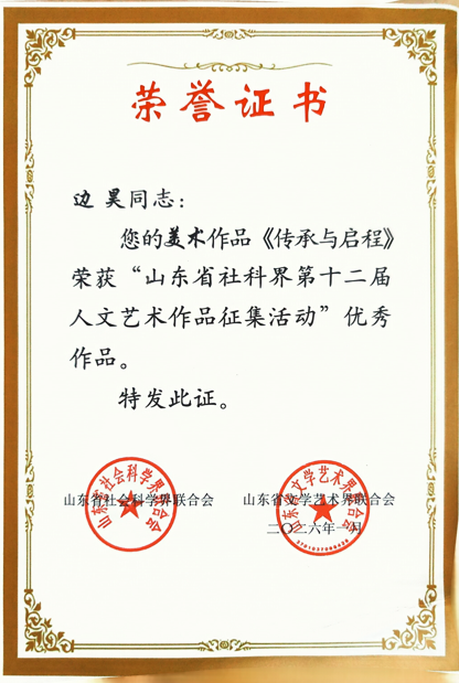 由山东省社会科学界联合会、山东省文学艺术界联合会联合主办,山东省社会科学发展交流中心、山东省美术家协会、山东省书法家协会、山东省摄影家协会共同承办的山东省社科界第十二届人文艺术作品大赛评选结果正式公布。我校人文艺术学院边昊教师的美术作品《传承与启程》和魏灿林教师的书法作品《书谱一则》均荣获全省优秀奖。