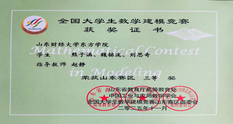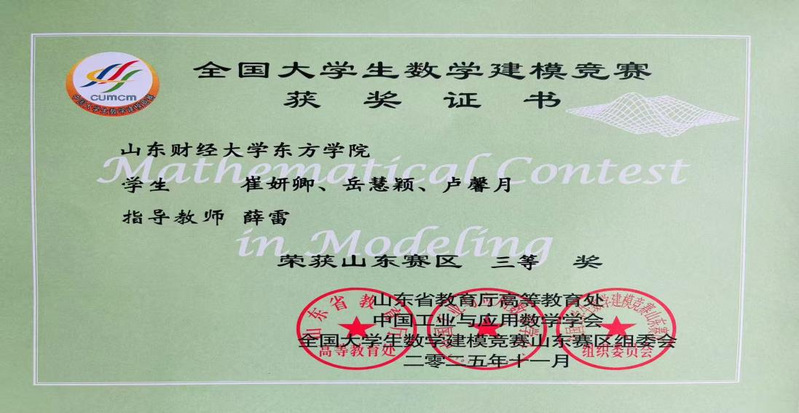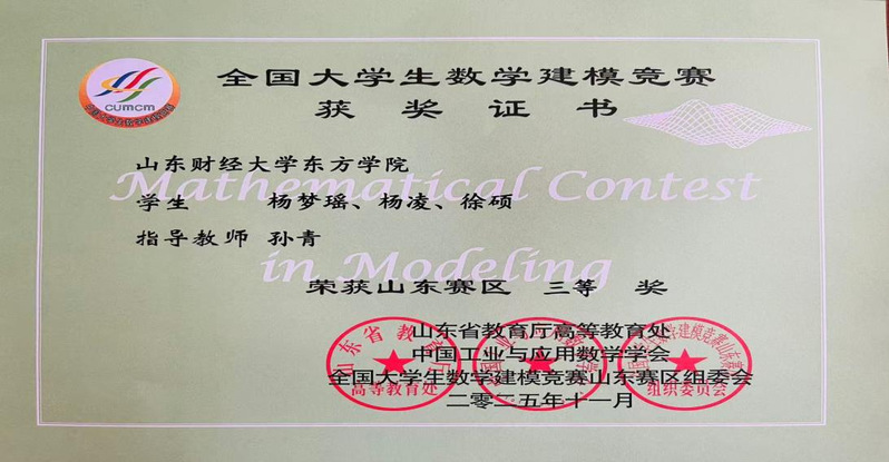 近日,2025年全国大学生数学建模竞赛获奖名单发布,经过赛区组委会组织专家的初评、终评,我校杨梦瑶、杨凌、徐硕团队;崔妍卿、岳慧颖、卢馨月团队;熊子涵、魏铭泷、刘思奇团队均获山东省三等奖。