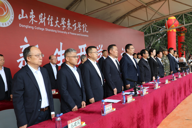 山东财经大学党委委员、副校长赵奎皓,山东财经大学东方学院董事长周萍婉,院长范玉宝,党委书记宋保峰,党委副书记江东,副院长于栋、宋凯明、孙延民,各部门、各单位负责人,教职工代表,在校生代表,军训教官及全体2025级新生参加典礼。典礼由江东主持。