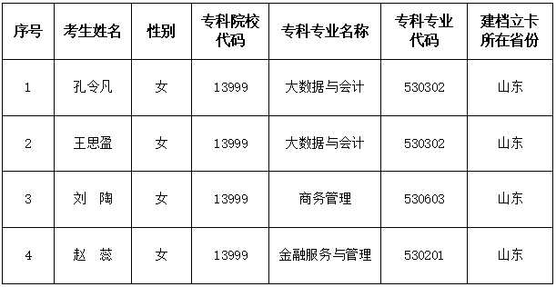 根据《关于做好山东省2026年普通高等教育专科升本科招生考试报名工作的通知》(鲁招考〔2025〕125号)文件规定,由考生自行申请,现将省内建档立卡家庭资格考生申请名单校内公示如下: