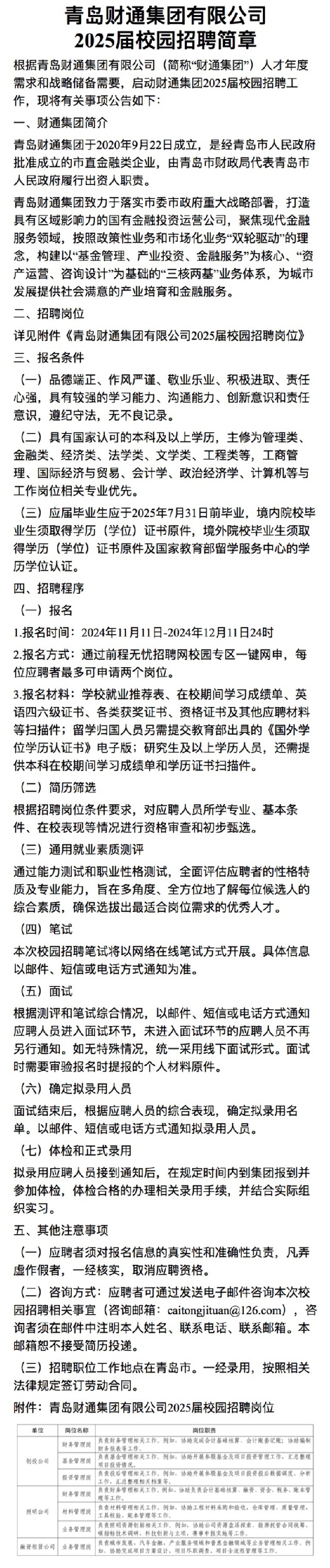 招聘 青岛财通集团有限公司2025届校园招聘简章