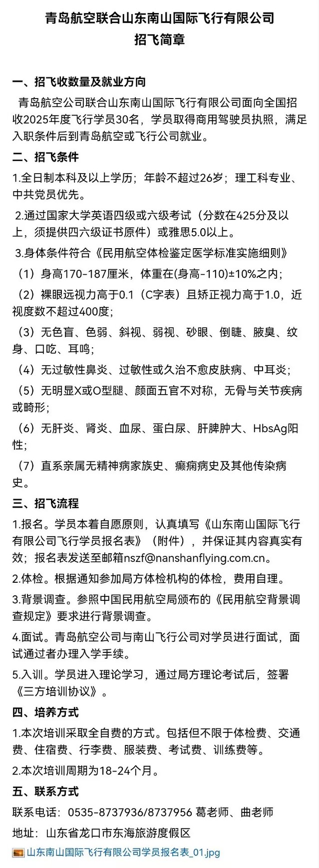 招聘 青岛航空联合山东南山国际飞行有限公司招飞简章