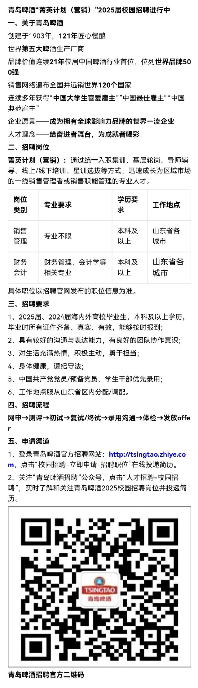 招聘 青岛啤酒“菁英计划(营销)”2025届校园招聘进行中