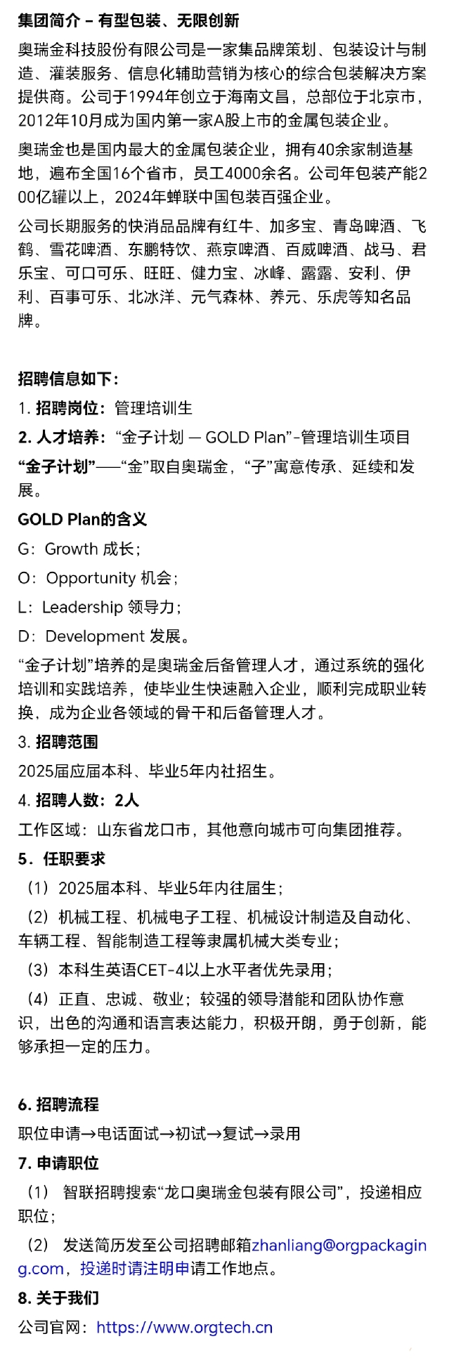 招聘 龙口奥瑞金包装有限公司2025年管理培训生招聘简章