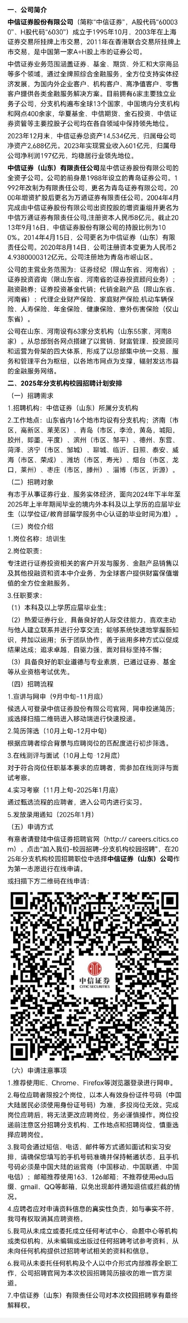招聘 中信证券(山东)有限责任公司2025年校园招聘简章