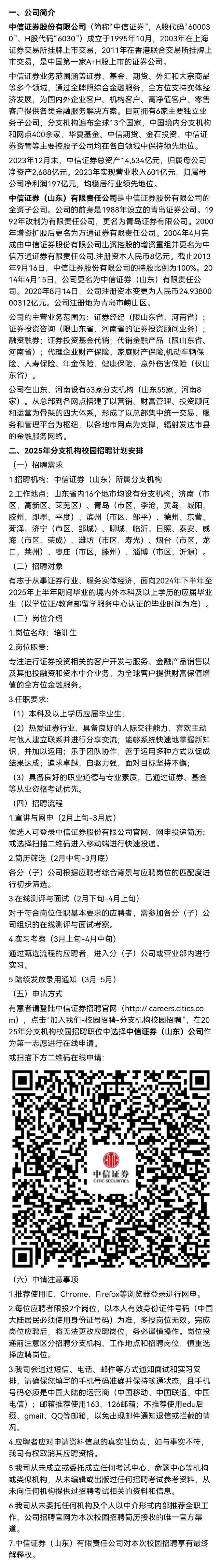 招聘 中信证券(山东)有限责任公司2025年校园招聘简章