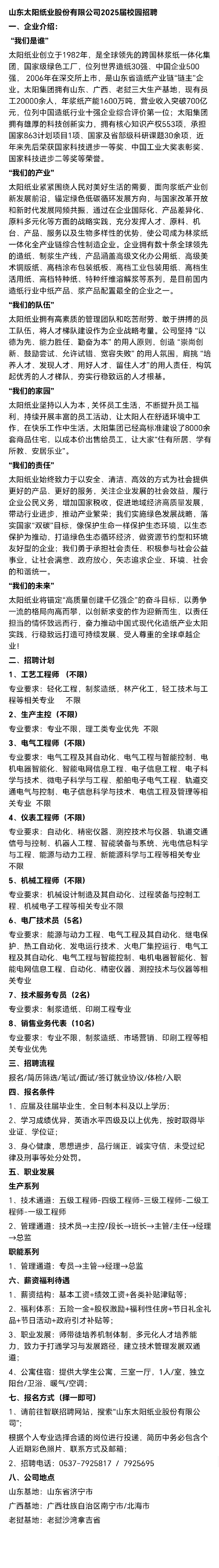 招聘 山东太阳纸业股份有限公司2025届校园招聘