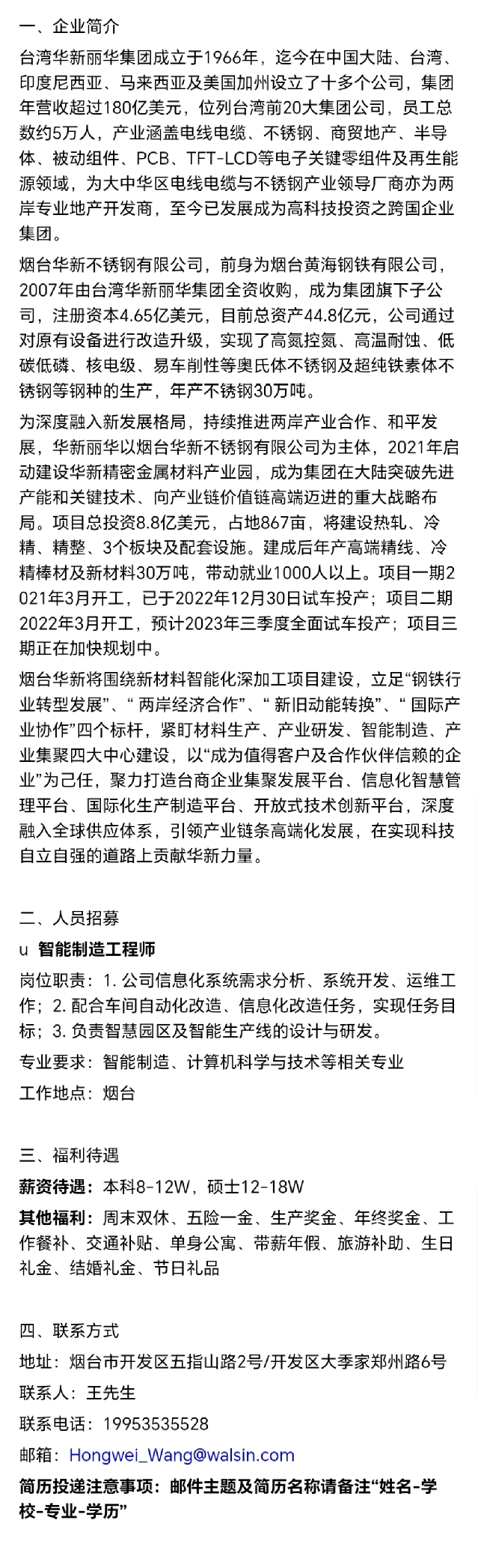 招聘 烟台华新不锈钢有限公司2025届校园招聘
