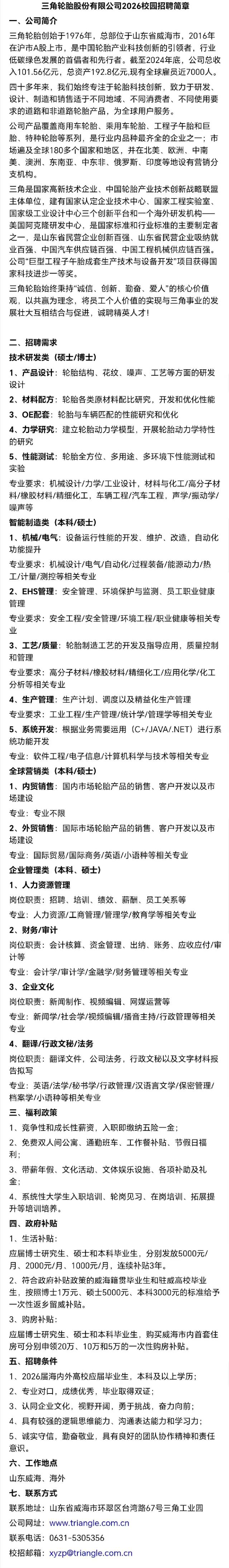 招聘 三角轮胎股份有限公司2026校园招聘简章