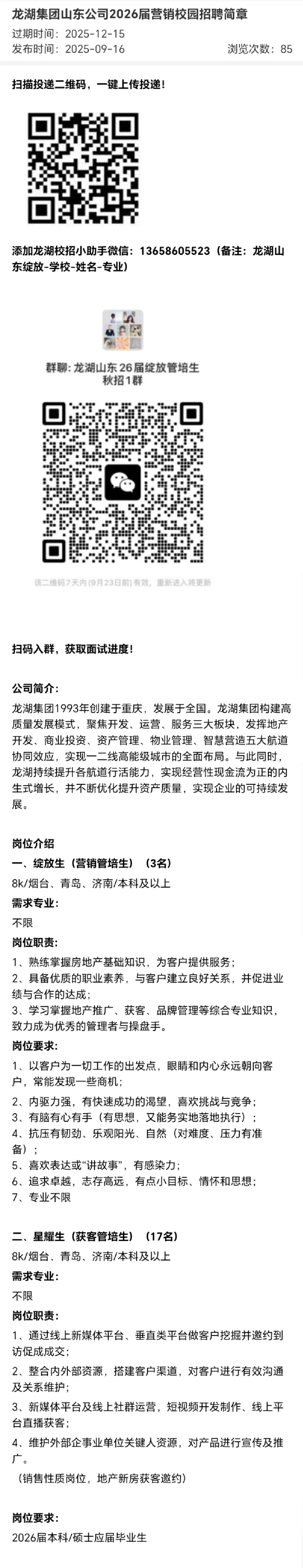 招聘 龙湖集团山东公司2026届营销校园招聘简章