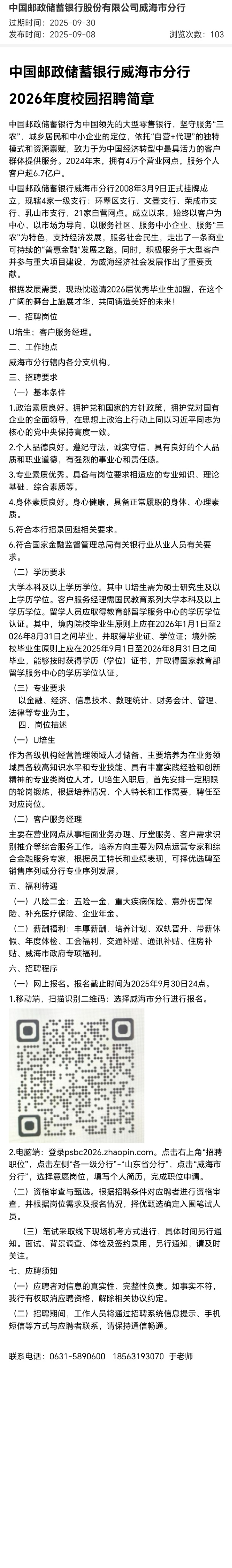 招聘 中国邮政储蓄银行股份有限公司威海市分行