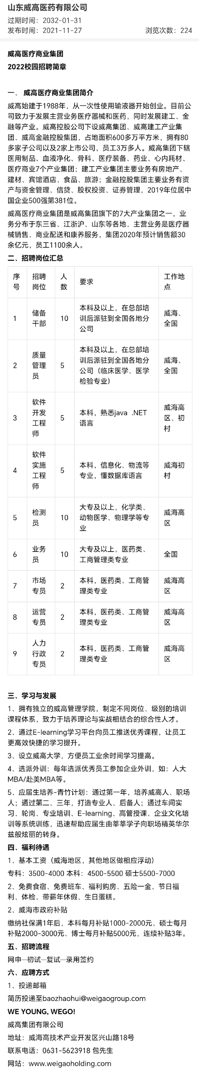 招聘 山东威高医药有限公司