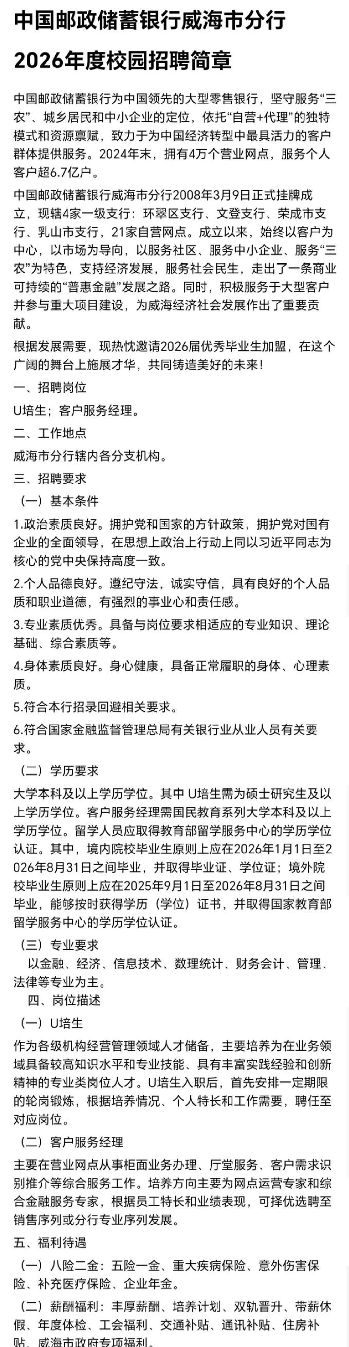 招聘 中国邮政储蓄银行威海市分行2026年度校园招聘简章
