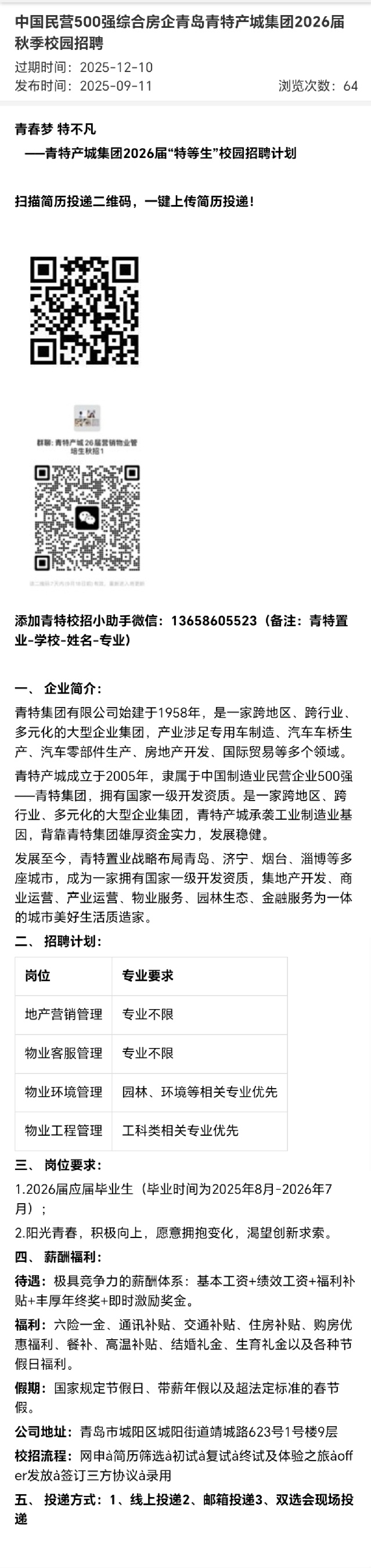 招聘 中国民营500强综合房企青岛青特产城集团2026届秋季校园招聘
