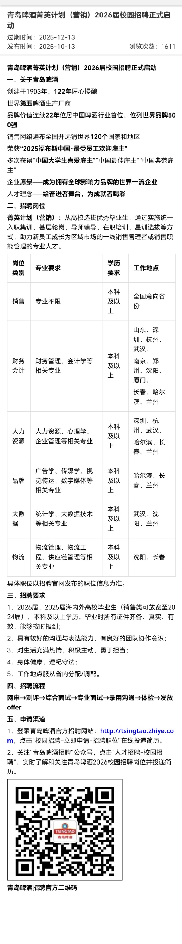 招聘 青岛啤酒菁英计划(营销)2026届校园招聘正式启动