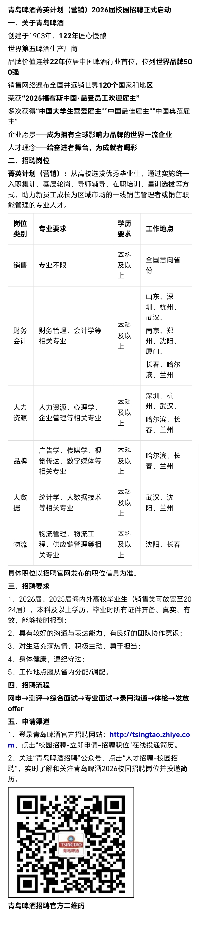 招聘 青岛啤酒菁英计划(营销)2026届校园招聘正式启动