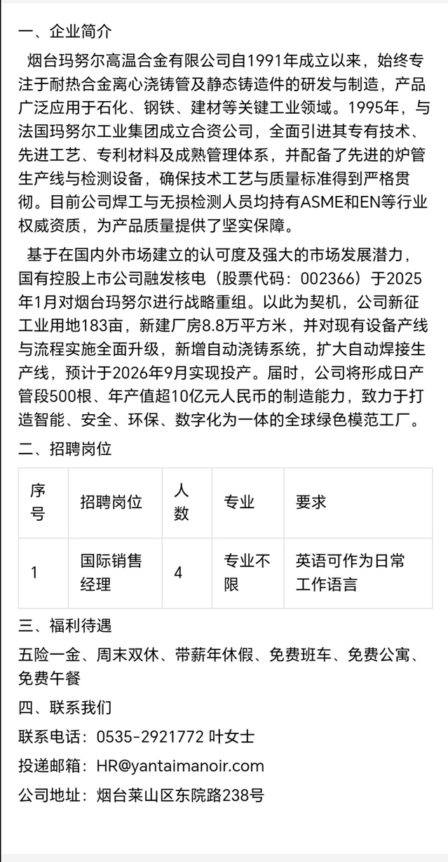 招聘 烟台玛努尔高温合金有限公司校园招聘简章