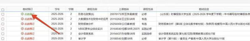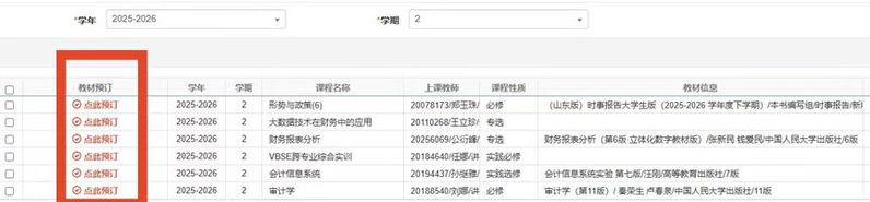 3.确认预订信息:系统内选择2025-2026学年第二学期,根据个人需求自主选择是否预订教材(没有教材信息的课程无推荐教材,可不预订)。如图所示: