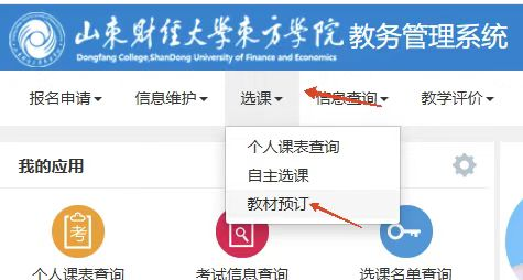 2.进入教材预订模块:登录后点击“选课/教材预订”菜单,如图所示: