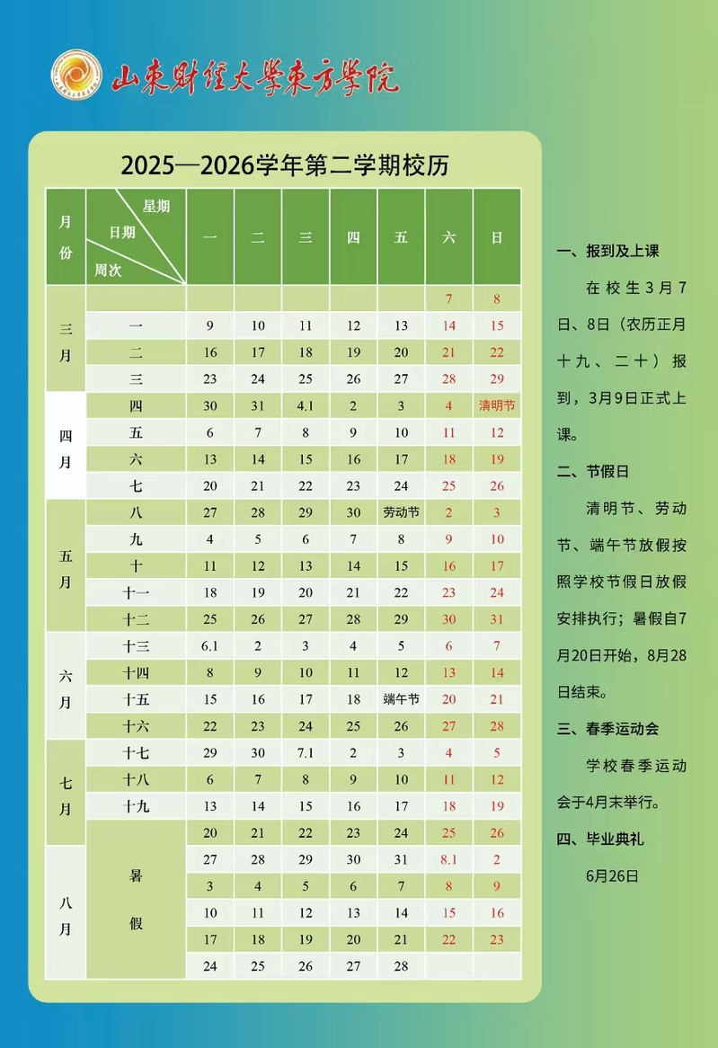 山东财经大学东方学院2025-2026学年第2学期校历