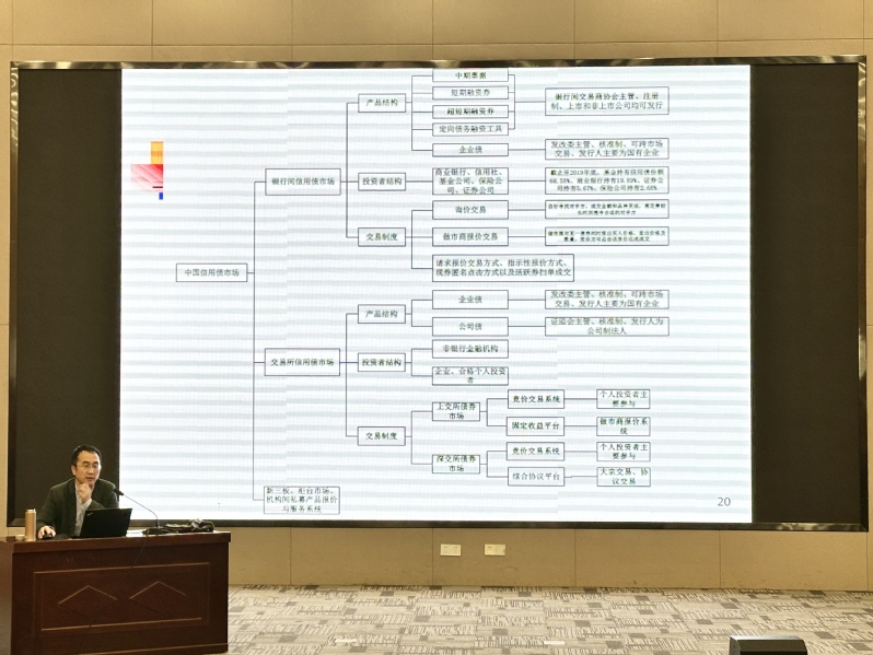 讲座中,张雪莹老师系统梳理了中国债券市场的发展历程及中国债券市场存量品种结构,结合当前市场环境,深入分析了债券市场在国家金融体系中的重要地位与功能。他详细介绍了固定收益证券的基本特征、定价机制及其与股票投资的区别,引用了《宽客人生》中“股票是故事,债券是数学”的经典观点,强调债券投资具有较强的数理基础和确定性,鼓励同学们夯实数量分析能力。同时,张老师结合毕业论文的选题方向,深入解析了债券信用利差的影响因素,为2023级学生提供了有价值的论文选题视角。