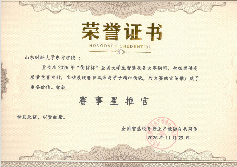 2025年“衡信杯”大学生智慧税务大赛设置校内赛、省赛、总决赛三个阶段赛。9月28日,财税金融学院组织开展校内赛,选拔出3支代表队参加省赛。11月4日,省赛如期举行,经过激烈角逐,由刘小雨、于浩洋、王丹梅组成的代表队以山东省省赛第一的成绩斩获省赛一等奖;由刘昊月、陈双凤、孙吉萱组成的代表队与赵世潇、陈文慧、楚君彤组成的代表队均获得省赛二等奖。11月29日,总决赛在江西财经大学拉开帷幕,共有来自西南财经大学、江西财经大学、海南大学、山西财经大学等知名院校在内的98支队伍入围决赛。我校代表队在高手云集的比赛中披荆斩棘,最终荣获全国三等奖。
