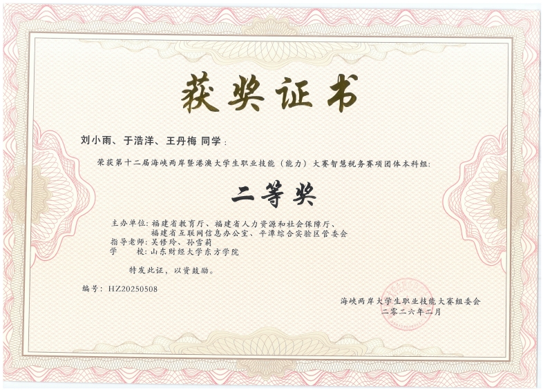 大赛吸引了71支大陆队伍、5支港澳台队伍共二百余名学生参赛,不仅顺应全球税收治理现代化发展趋势,更以“以赛促学、以赛促教、以赛促融合”为宗旨,为两岸暨港澳学子提供了同台竞技、切磋技艺的契机,有效促进了区域间数字税务领域的交流融合,为培养复合型智慧税务人才、服务国家治理体系和治理能力现代化奠定了坚实基础。由我院税收学专业学生刘小雨、于浩洋、王丹梅组成的代表队在吴修玲和孙雪莉老师的指导下获得了“二等奖”的优异成绩。