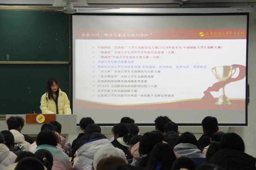 张思琪结合商务英语专业特点,从英语的听、说、读、写方面分享了心得,建议提前搭建知识框架,因科制宜,多模仿,勤练习,实现从“敢说”到“会说”的能力飞跃。曹燚聚焦学科竞赛,从常见问题、比赛案例和备赛全程三个方面分享了参赛经验,为同学们规划备赛路径、提升竞赛水平提供了切实参考。
